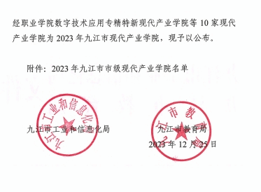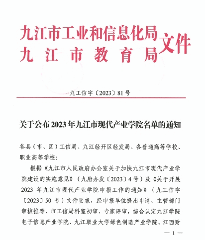近日,九江市工业和信息化局与九江市教育局联合发布公告,经过严格的评审和筛选,我院电子信息产业学院被正式认定为2023年九江市现代产业学院。此次共有10家现代产业学院被认定为2023年九江市现代产业学院,我院电子信息产业学院排名第一。