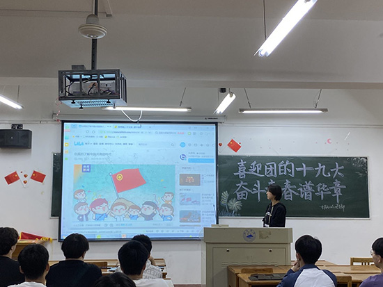 为深入学习贯彻习近平新时代中国特色社会主义思想,引导广大青年厚植爱党、爱国、爱社会主义的情感,争做有理想、有本领、有担当的时代青年,庆祝中国共产主义共青团第十九次全国代表大会的召开。我院于5月23日晚在竞知楼各班教室开展“喜迎团的十九大,奋斗青春谱华章”主题团日活动。