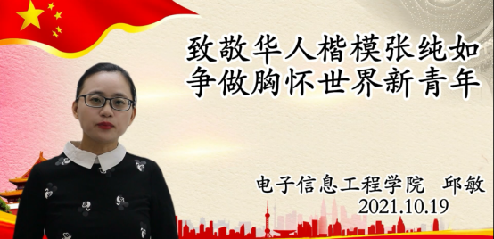 我院邱敏老师参赛作品是以“致敬华人楷模张纯如,争做胸怀世界新青年”为主题,通过对张纯如女士的事迹的深情讲述,将张纯如女士高大的形象立体地呈现给观众,并号召新时代的中国青年要像张纯如女士学习,既有家国情怀,又能胸怀天下,为人类社会的发展充分展示泱泱大国青年的气度与格局,责任与担当。本次教师组共有50余名参赛者,邱敏老师凭借着努力和实力最终脱颖而出,取得第一名的好成绩。