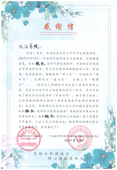 近日,共青团南昌市东湖区委向Williamhill威廉希尔发来感谢信,感谢我校williamhill中国A2012班魏凯同学在疫情突袭南昌市时,积极主动投身到社区疫情防控工作中,为南昌市东湖区疫情防控工作筑起“青春防线”;同时东湖区委也对我校培养出的如此优秀学生表示感谢!