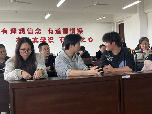 在互动交流环节,学生代表踊跃发言,既表达了对学院发展成果的认可,也坦诚提出实际问题。针对部分学生到课率不佳、基础实验设备故障率较高、合班授课效果有待提升等问题,师生现场展开热烈探讨。教师代表结合当前学生学习现状,分享了提升听课效果的系列举措,包括优化教学方法、增加互动环节、强化课堂管理等。同时,师生还围绕实践能力提升、考研备考指导、就业趋势分析、学科竞赛备赛等学生关心的话题深入交流,教师们逐一解答疑问并给出针对性建议。