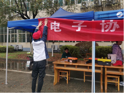 今天虽然没有下雨,但是室外的温度还是比较低,冷风不停,凉意不止,可是这丝毫没有削弱大家的工作热情。随着时间的推移,前来询问、拿着电子产品来维修的同学也络绎不绝。
