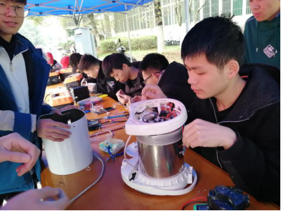 对于前来维修的同学,先由负责接待的人员记录好维修产品的相关信息并对其进行分类、装袋,方便维修成员进行维修。面对源源不断的维修物品,维修成员没有丝毫不耐烦,激情十足,战斗力也十足!他们熟练地卸螺丝、检测、换零件、焊接、组装、测量,一个小电饭锅、一个耳机、一个排插等又都能正常工作了。每一次成功地修好电子产品,都会给他们带来无限的激动和成就感。对于现场未能及时修好的物品,大家都没有轻易放弃,会带回到电子开放实验室进行进一步的维修。在整个义务维修活动中,大家的热情服务及专业技术得到了广大师生的好评。