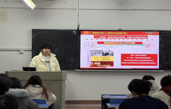 为深入学习贯彻党的二十届四中全会精神,切实加强学生干部思想政治引领,推动党的创新理论入脑入心、见行见效,12月15日晚,我院在竞知楼805教室举办“深入学习贯彻党的二十届四中全会精神”专题学习会。本次学习会由院学生会主席陈文钦主讲,学生会各部门负责人及骨干成员共计40余人参加。