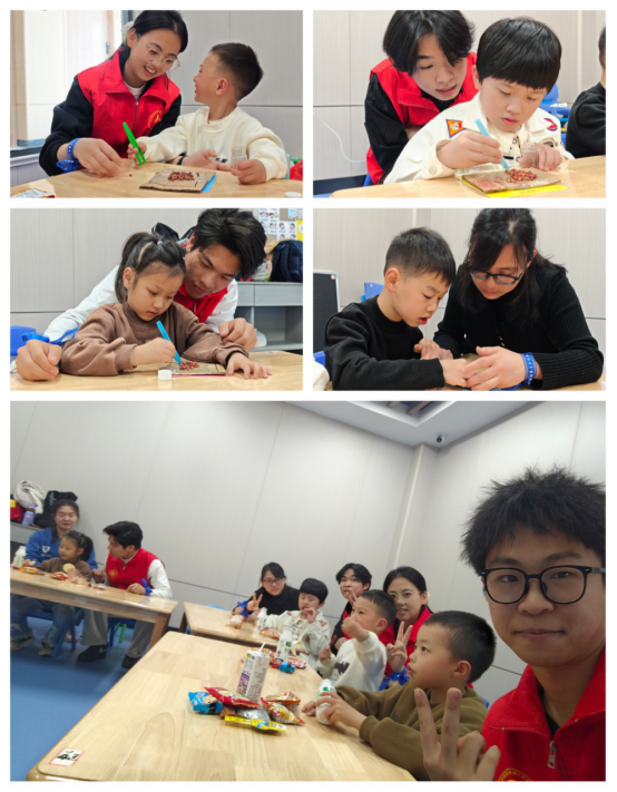 活动现场暖意融融,“芯小青”志愿者们分组行动,用陪伴传递爱意,用互动点亮温情。在手工环节,志愿者们俯身相伴,手把手教孩子们贴贴纸、挑豆子、拼图案,一遍遍地示范、一次次地鼓励,引导孩子们大胆动手、勇敢尝试,当孩子们完成属于自己的小作品,露出天真烂漫的笑容时,志愿者们的心中也满是欣慰与感动;在感统训练环节,志愿者们牵着孩子们的小手,运动、拍球、做游戏,用轻柔的话语和肢体语言,慢慢拉近与孩子们的距离,打破陌生的隔阂;最后,志愿者们主动协助学校老师整理教室、清点教学物资、擦拭活动器材,细致打理校园的每一个角落,为孩子们营造整洁、舒适、温馨的学习与活动环境。